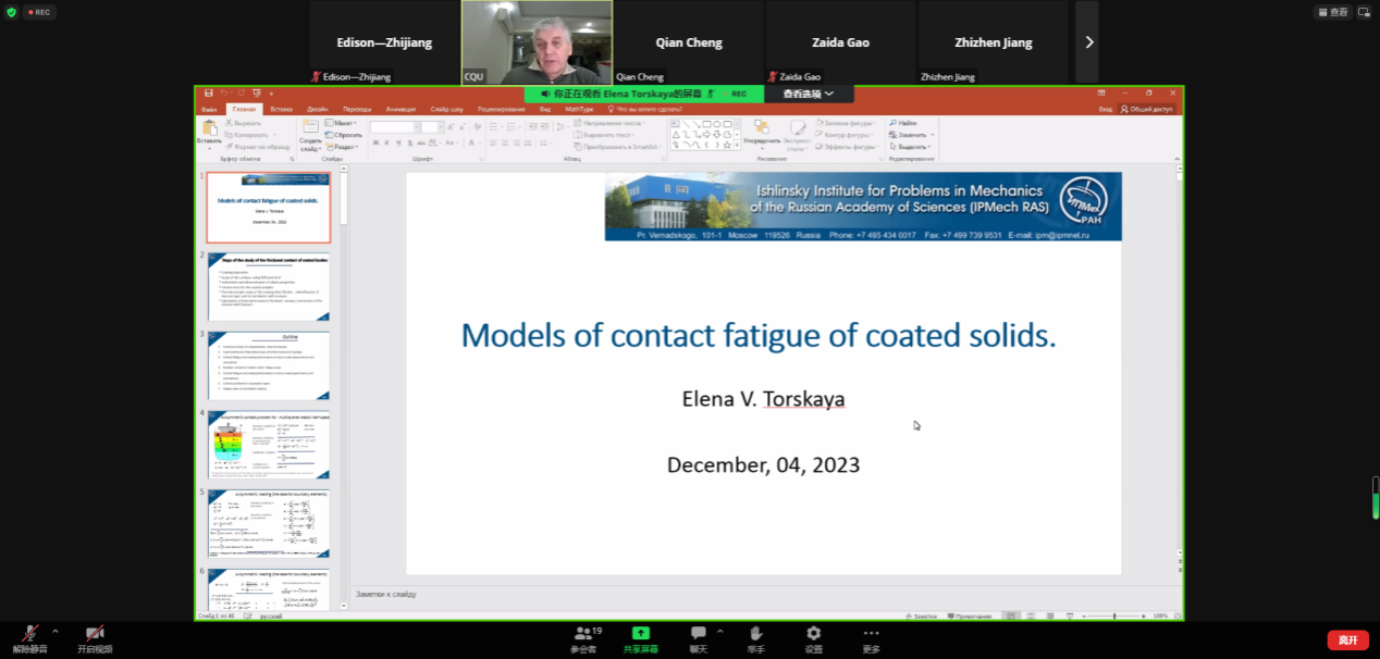2023年12月4日19:00,奈飞 “跨学科力学前沿研究“全球系列讲座第6期在线召开,并圆满结束。本期讲座邀请到Elena V. Torskaya教授作为主讲嘉宾,报告题目为“Models of contact fatigue of coated solids”。 Elena V. Torskaya教授毕业于莫斯科物理与技术学院,并于1995年获得该校固体力学科学研究生学位。她自1994年开始在莫斯科仪器工程与信息学院任教,并于1995年在俄罗斯科学院Ishlinsky力学研究所...
