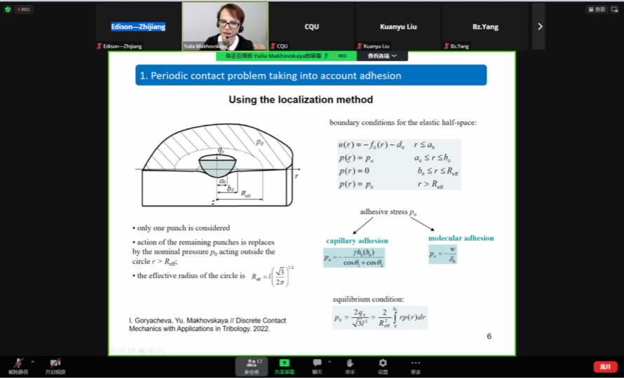 详情 奈飞 “跨学科力学前沿研究“全球系列讲座第4期、第5期分别于2023年11月20日和11月27日19:00在线召开,圆满结束。讲座先后邀请 Yulia Makhovskaya研究员开展了主题为“Adhesive Contact of Elastic Bodies with Surface Microgeometry”的学术讲座和Fedor Stepanov研究员开展了主题为“Elastic Indentation of Tribological Materials and Coatings: Experiments and Computation”的学术讲座。 Yulia Ma...