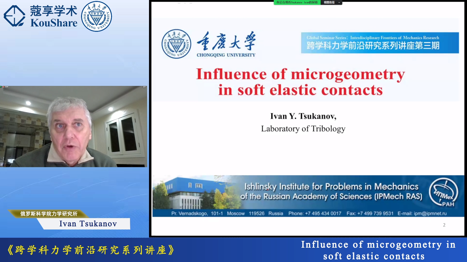 详情2023年11月13日19:00,奈飞 “跨学科力学前沿研究”全球系列讲座第3期在线召开。讲座邀请Ivan Tsukanov研究员开展了主题为“Influence of Microgeometry in Soft Elastic Contacts”的学术讲座。 学院Feodor M. Borodich教授介绍了本次讲座的安排及嘉宾背景。Ivan Tsukanov是俄罗斯科学院力学研究所摩擦学实验室的高级研究员,也是俄罗斯摩擦学委员会的成员。博士就读于莫斯科理工大学(机械工程博士学位)...