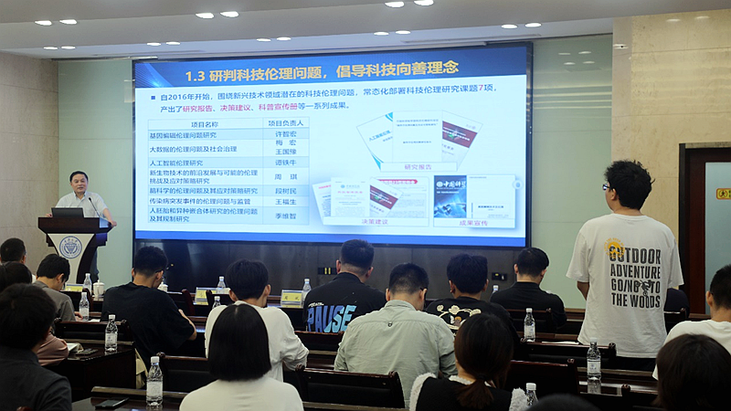 为大一新生开设的《工程学导论》课程中包含科技伦理相关内容时,胡海岩院士表示了充分肯定,并针对如何在高校师生中开展科技伦理教育的问题提出了若干建议。报告结束后,胡海岩院士还详细回答了现场师生的提问。