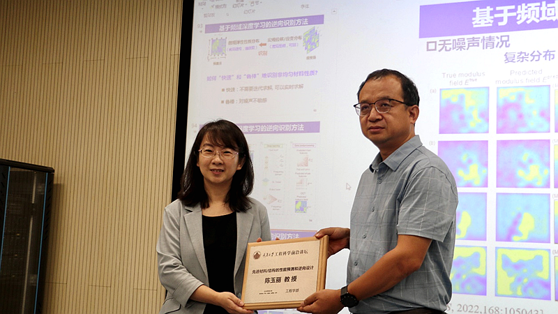 陈玉丽教授的报告以我国对于高性能先进材料应用的迫切需求以及所面临的材料力学性能预测和设计方面的挑战为背景展开,首先介绍了如何通过材料的微观结构实现宏观性能的准确预测。她以陶瓷基复合材料为例,通过建立的一系列考虑纤维/基体界面影响的性能预测模型,揭示了界面层厚度、模量、热膨胀系数等因素对基体开裂应力和开裂模式的影响机理,并着重探究了纤维表面粗糙度与界面层的耦合效应对界面摩擦力的影响以及界面剪切模量与强度随界面层微观织构(OA角)变化规律。随后,她详细讲解了基于三维像素化的力学超材料设计概念,实现了结构本构曲线的快速定制和重定制。同时,团队还在“啪啪圈”小玩具的启发下,将该结构应用于一系列手性蜂窝构型中作为连接韧带,开发出可实现超快速响应、可定制化的大幅度变形以及无需外界输入的形状可重构超材料,在快速变形机器人和变形飞行器等领域有潜在应用价值。最后,她还详细讲解了基于机器学习提出的复杂模量场的逆向识别方法。从宏观可测的应变场到微观难获取的模量场,实现“快速”和“鲁棒”地识别非均匀材料的性质。此方法泛化能力强,可以打破尺寸限制,也能够有效应对数据缺失,在肿瘤检测领域具有良好的应用前景。