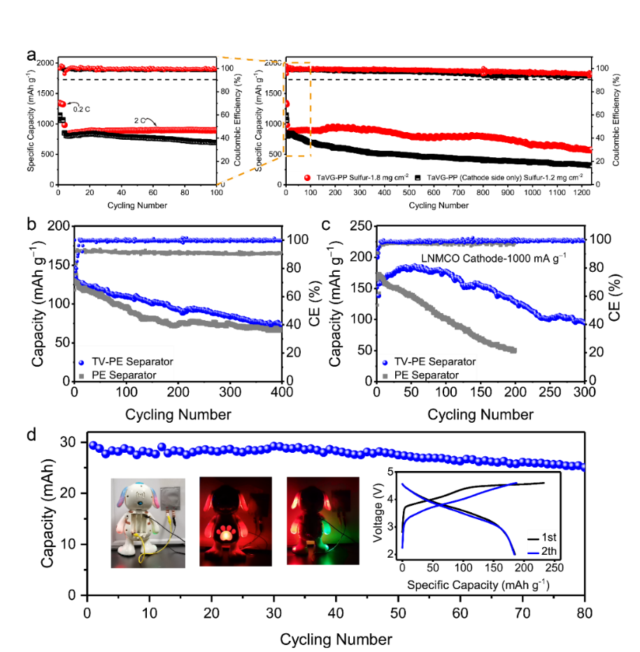 该团队采用简单的涂覆工艺将氧化石墨烯纳米片包裹的硫化钒和单宁酸功能涂层均匀的负载到商用聚烯烃隔膜上。该功能涂层单面厚度仅为1.5 μm左右,涂层载量仅为0.15 mg cm-2左右(远低于商用勃姆石涂层的负载量),具有良好的力学性能,且能够实现大面积制备。该复合隔膜能够保证金属锂负极实现了6000小时稳定循环以及金属锂负极表面致密平整的沉积状态。理论模拟结果表明:复合隔膜能够保证锂负极表/界面处离子和电场均匀分布,实现锂离子的均匀输运和沉积,进而削弱缺陷处的沉积放大效应,避免锂枝晶和死锂的产生。进一步采用XPS深剖技术解析了SEI的化学组成,证实了功能隔膜对金属锂负极表面的调控作用。DFT计算证明了功能涂层组分对硫正极侧多硫化物的协同催化作用。最后,基于该复合隔膜组装的金属锂电池实现了稳定循环,并展示了软包锂电池驱动小型电动机器人的应用。与此同时,该功能涂层还可赋予复合隔膜良好的耐热性,可显著提升金属锂电池的安全性,具有广泛的应用前景。