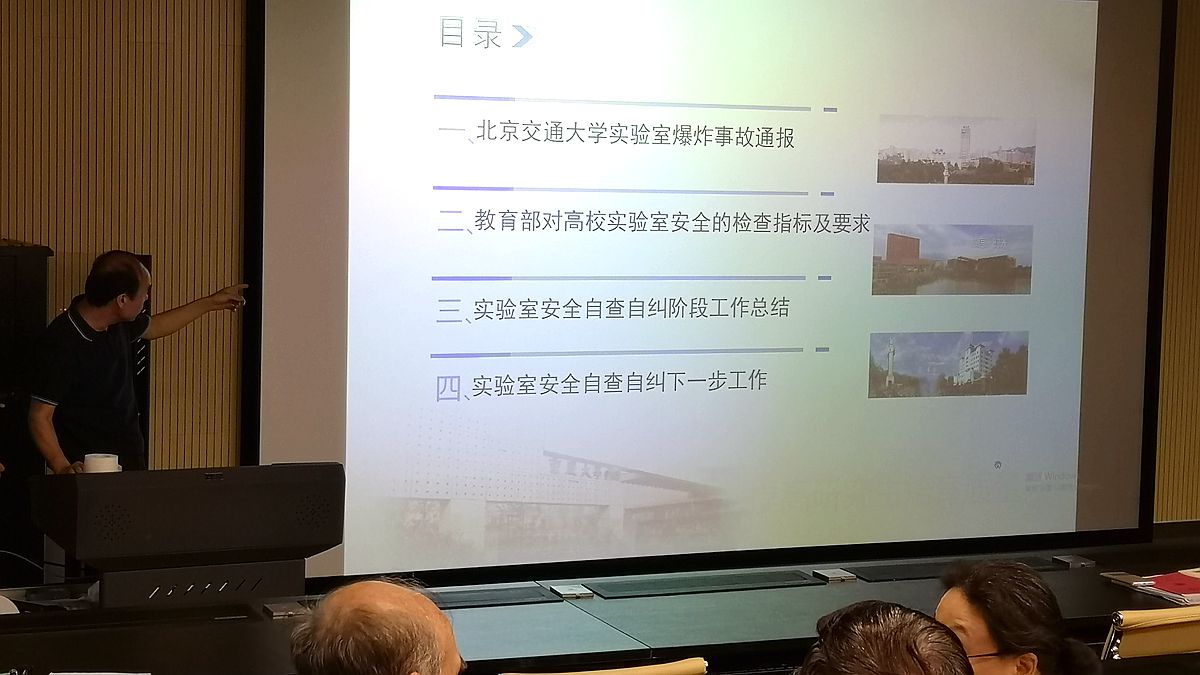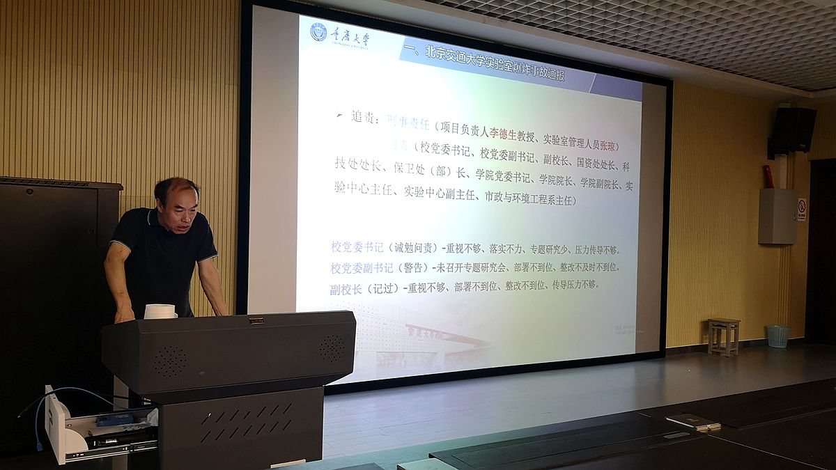 刘占芳首先传达了周一学校召开的实验室安全工作会暨教育部2019年度高校科研实验室安全检查工作推进会的会议精神。他首先向全体教职工通报了北京交通大学“12.26实验室爆炸事故”及调查的事故原因,并指出一定要吸取教训,避免此类事故的发生。接着他介绍了教育部对高校实验室安全的检查指标及要求,并结合指标体系通报了学校2019年实验室技术安全自查自纠的情况,并对学院实验室存在的典型问题进行分析,部署了后续的隐患整改、迎检相关工作。他强调一定要落实安全责任制,各实验室负责人要重视实验室安全,严格落实实验室准入制度。同时各位老师要将教育部对于实验室的安全检查要求传达到每一位学生,全面做好各项工作,迎接教育部科研实验室的安全检查。