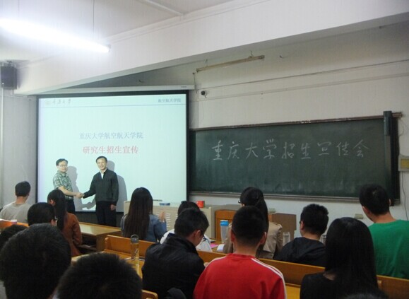 的概况,随后就学院今年的招生细则作了详细的说明。严院长生动详实的介绍让在座的各位同学对重大航院表现出了很高的兴趣,大家纷纷举手提问,胡院长和严院长也耐心回答了各位同学提出的问题,宣传会在热烈的气氛中圆满落幕。