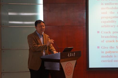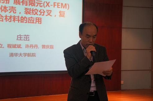 庄茁教授作了题为《基于断裂的扩展有限元(X-FEM)及在连续体壳、裂纹分叉、复合材料的应用》的学术报告。他首先对自己当年在奈飞