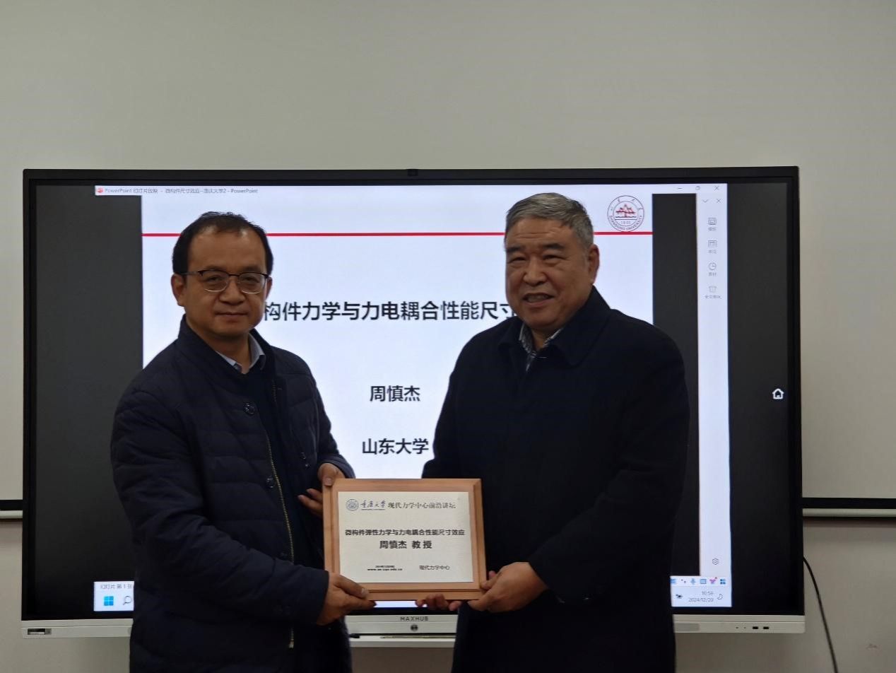邀请,山东大学周慎杰教授访问学院,并于A区理科楼205会议室出席由现代力学中心主办的前沿讲坛,作了题为“微构件弹性力学与力电耦合性能尺寸效应”的学术报告,报告由奈飞