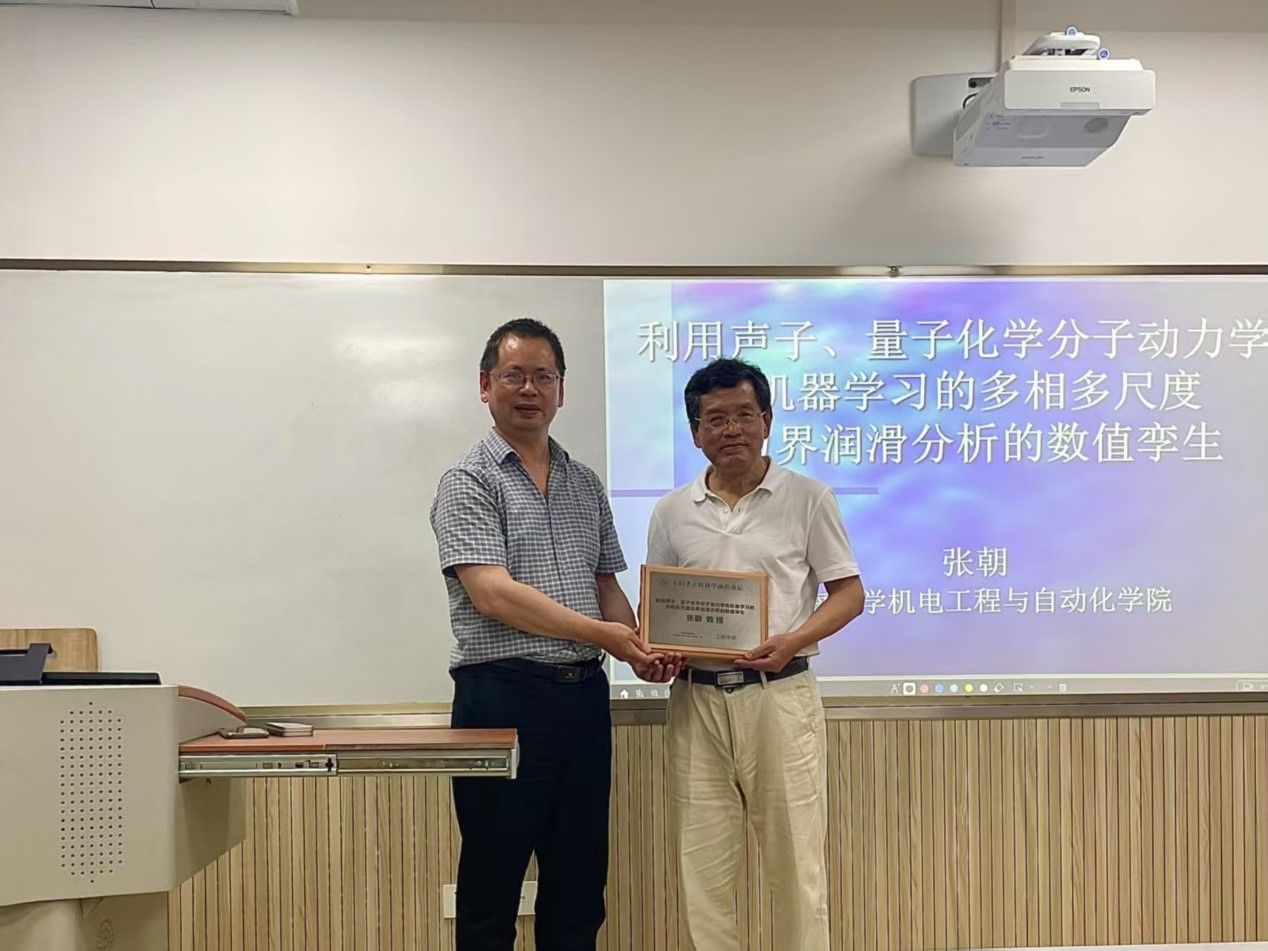 邀请,上海大学机电工程与自动化学院张朝教授在理科楼出席由工程学部主办的工程科学前沿讲坛,并作了题为“利用声子、量子化学分子动力学和机器学习的多相多尺度边界润滑分析的数值孪生”的报告。报告由奈飞