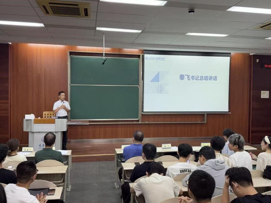 虎溪校区D1134教室举行2024级新生启航大会。学院党委书记奉飞、副院长姚建尧、学生办公室相关老师及奈飞
