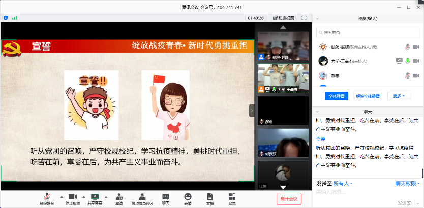 于2020年5月31日18:00-20:00在腾讯会议APP上举办了以“绽放战疫青春•新时代勇挑重担”为主题的研究生党团活动。