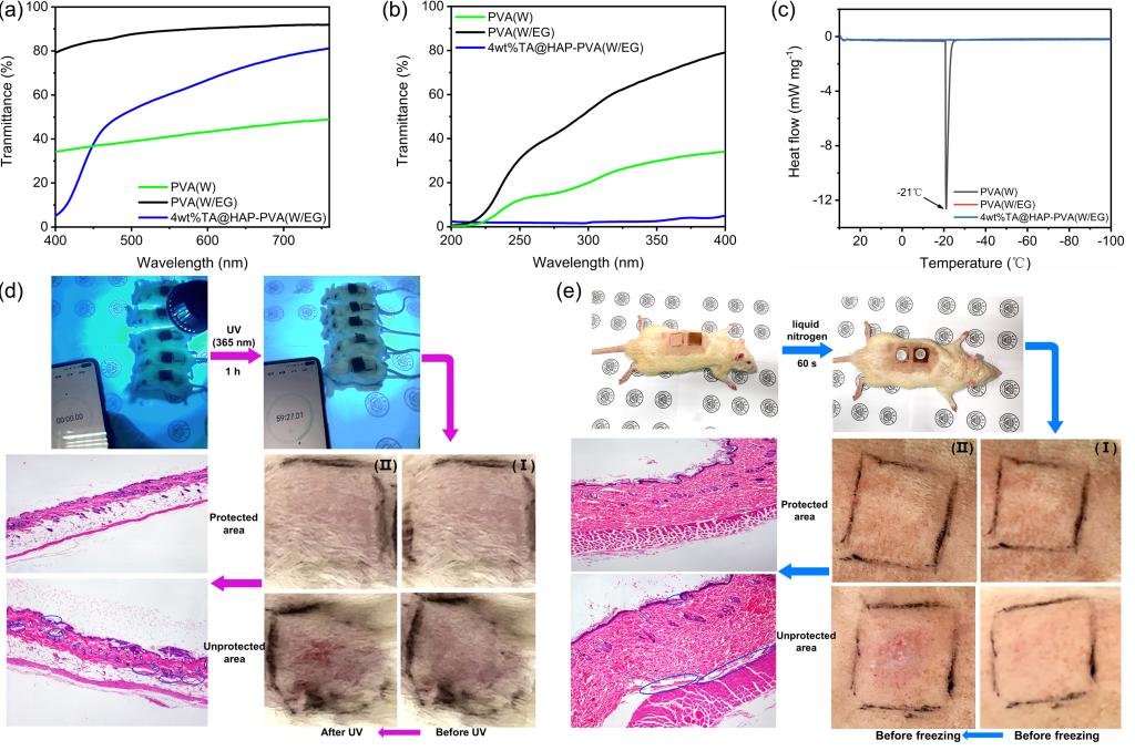 同时,TA@HAP NWs-PVA(W/EG)离子水凝胶还在紫外线过滤,防冻和保水方面表现出良好的实用性,可用作在高原,高海拔或高空区域的抗紫外线敷料,以及严寒地区的皮肤敷料。其原理是利用尺寸效应的反射和儿茶酚基团的吸收紫外光的作用,实现了紫外线过滤功能。利用乙二醇和水分子之间的强氢键作用,实现防冻性和保水性。