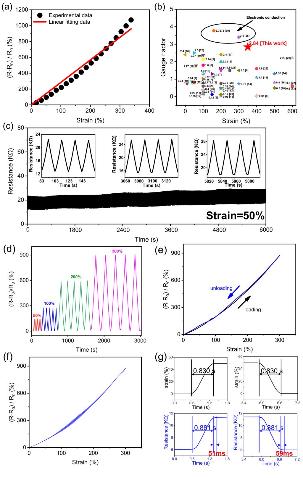 通过对应变传感性能的测试发现,TA@HAP NWs-PVA(W/EG)离子水凝胶应变传感器具有宽的应变传感范围(350%),高线性度(R2=0.99003),高灵敏度(GF=2.84),低传感迟滞性(2.4%),快速响应(~50 ms)和耐用性。其大部分指标均处于本研究领域的先进水平。此外,还可以对于压力传感器和温度传感器,均表现出良好的线性度。利用温度和应变的灵敏度的巨大差异,实现了温度和应变之间的解耦目的。因此,该离子皮肤具有多用途传感的功能。
