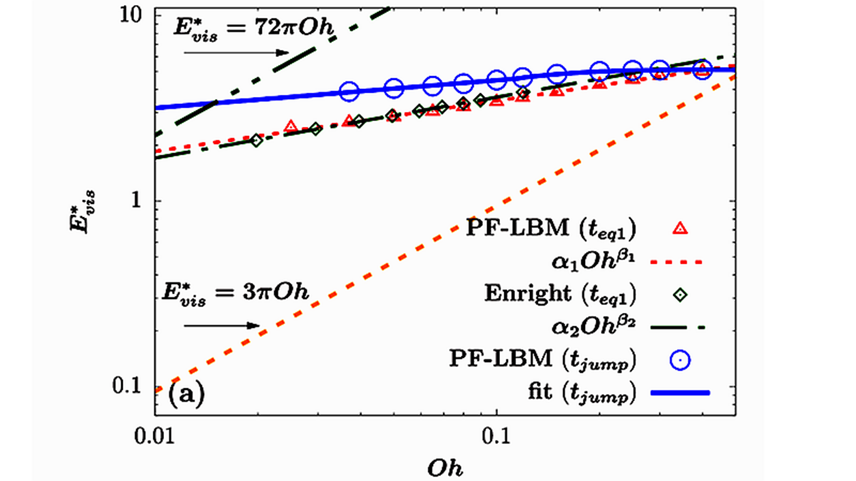 固体表面液滴的自发合并弹跳在凝结传热、防雾、防冰表面等领域有重要意义,是实现滴状冷凝传热、防雾、防冰等功能的基础。例如,水蒸气在固体表面遇冷初期凝结为尺寸极小的水滴,通过水滴间的合并及与固壁的相互作用可获得垂直表面方向的速度,在粘附性较小的超疏水表面上合并后的液滴可跳离表面,从而避免表面被水覆盖。该过程中液滴表面能减小,其中一部分转化为动能,另一部分被流体粘性所耗散。多年来,针对超疏水表面液滴合并弹跳的理论模型大都基于能量分析,并根据一种简化分析得到该过程中的粘性能量耗散和Ohnesorge(Oh)数成正比(即线性形式,Oh数反映了粘性效应和毛细-惯性效应的相对重要性)。黄军杰等利用三维相场格子Boltzmann方法,通过数值模拟揭示了两个大小相同的自由液滴合并过程中的能量耗散近似和Oh数的0.3次方成正比,而非简化分析预测的和Oh数成正比,并且发现壁面的存在会使得固壁附近液滴合并过程中的能量耗散大于液滴自由合并。他们还发现,液滴在弹跳时的动能由平动动能和震荡动能两部分组成,其中平动动能占总动能的比随Oh数增加而增加,而非以往模型中采用的固定值。基于数值模拟结果,他们提出了一种新的不润湿(无粘附)表面附近液滴合并弹跳的模型,并且通过“两阶段分析”将其推广到有一定粘附的超疏水表面。和大量相关实验及数值模拟结果的比较显示,该新模型能更准确地预测微纳米尺度液滴合并弹跳的速度,其对发生弹跳的临界液滴尺寸的判断显著优于之前采用线性形式能量耗散的模型。该工作修正了现有的对液滴合并过程中能量耗散的认识,对于后续相关问题的理论模型研究有重要参考价值。