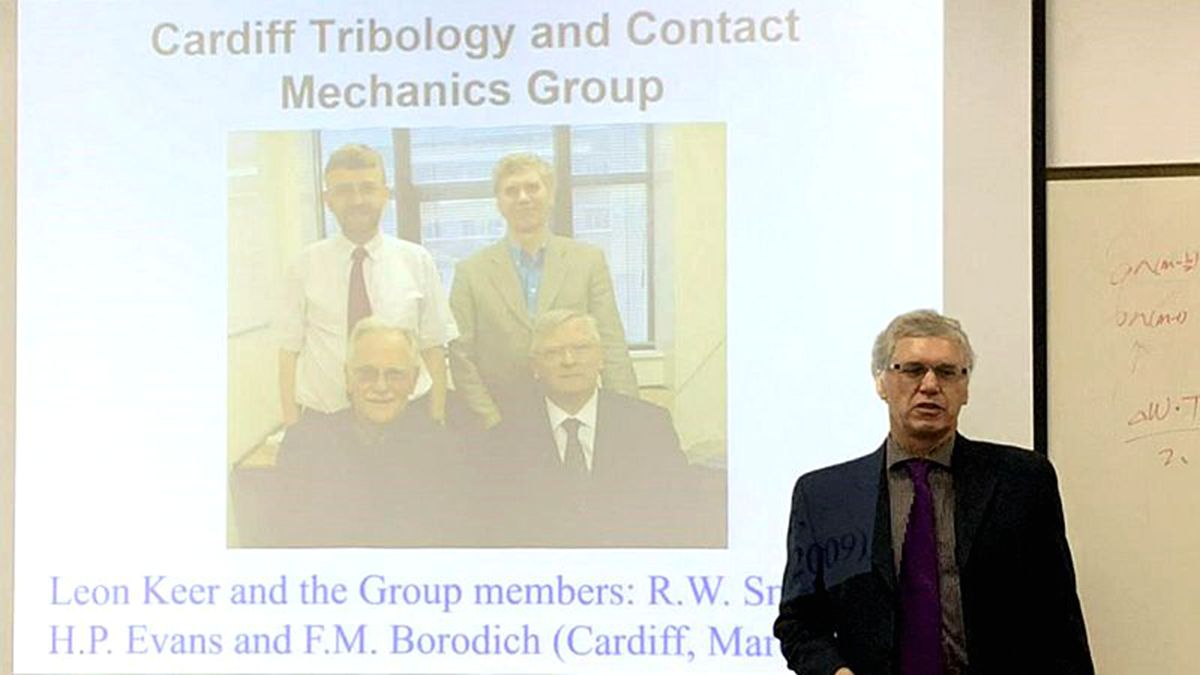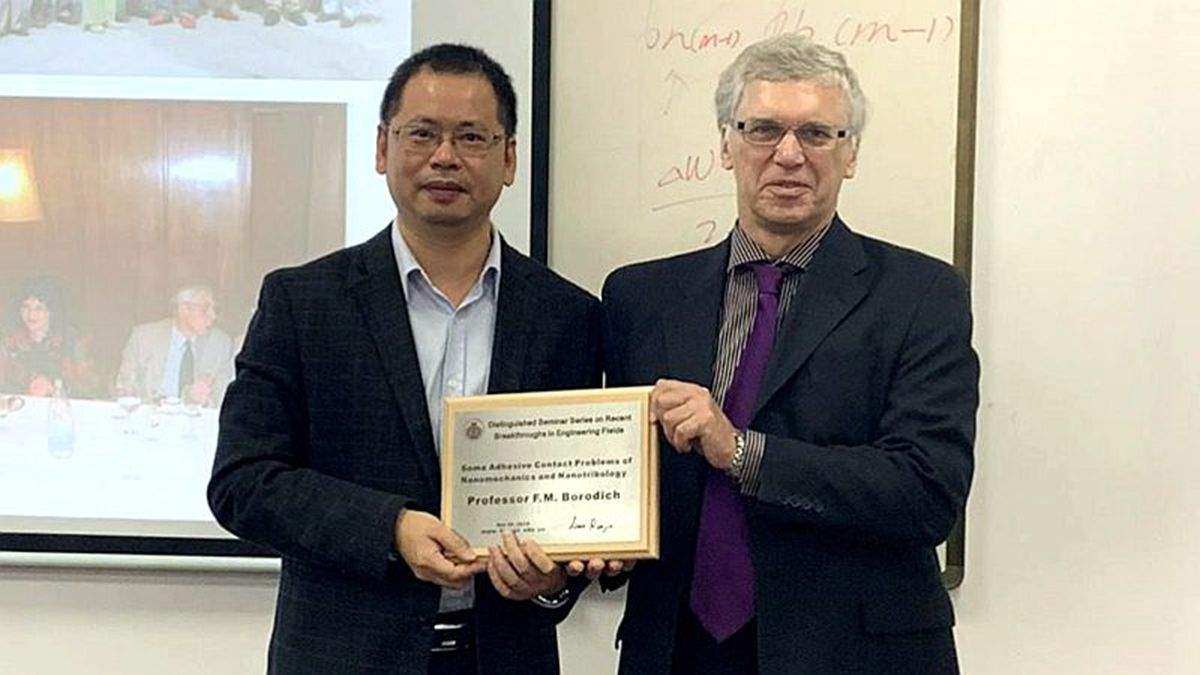 金晓清首先对Borodich教授进行了简要介绍:Borodich教授于1990年在莫斯科国立大学力学与数学系获得科学博士学位,1996年当选俄罗斯非线性科学院院士,并于2018年再度当选俄罗斯科学院外籍院士;目前在卡迪夫大学工程学院担任终身教授,兼任卡迪夫大学纳米科学和纳米工程跨学科中心主任,还担任了由著名的“利华休姆信托基金”赞助支持的CARBTRIB国际学术组织主席。Borodich教授在纳米力学和纳米摩擦学等领域提出了以其名字命名的B-G方法,是该领域的国际知名学者。