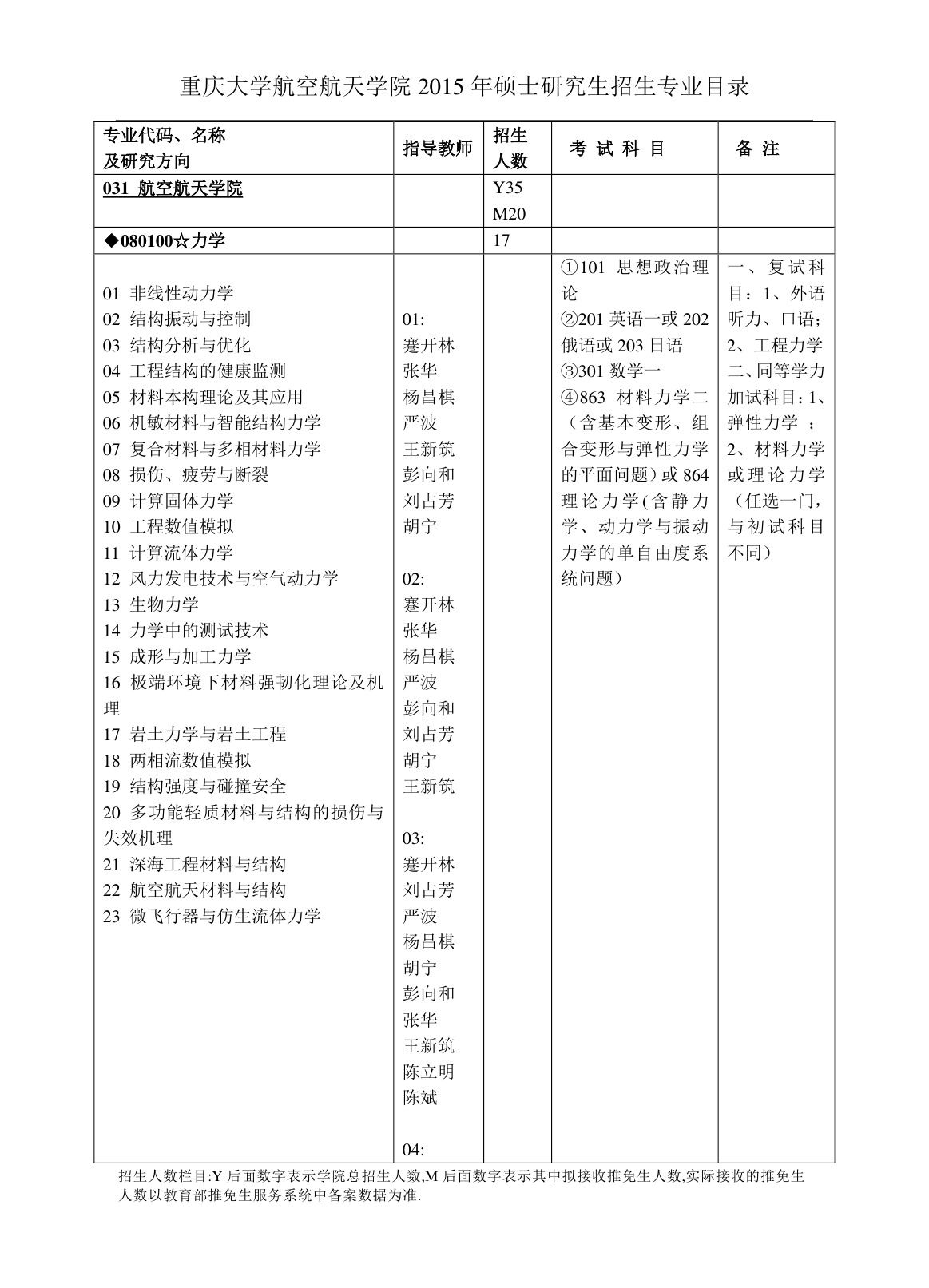 力学学术型硕士研究生招生目录