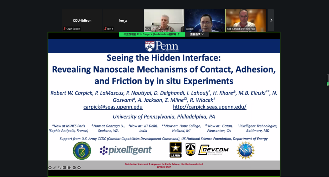 举办了第7期和第8期“跨学科力学前沿研究”全球系列讲座。两场讲座在线上举行,邀请到Robert Carpick教授和Julius Kaplunov教授作为主讲嘉宾,报告题目分别为“Seeing the Hidden Interface: Revealing Nanoscale Mechanisms of Contact, Adhesion, and Friction by in situ Experiments”和“Dynamic contact of thin-walled elastic structures with Environment”。