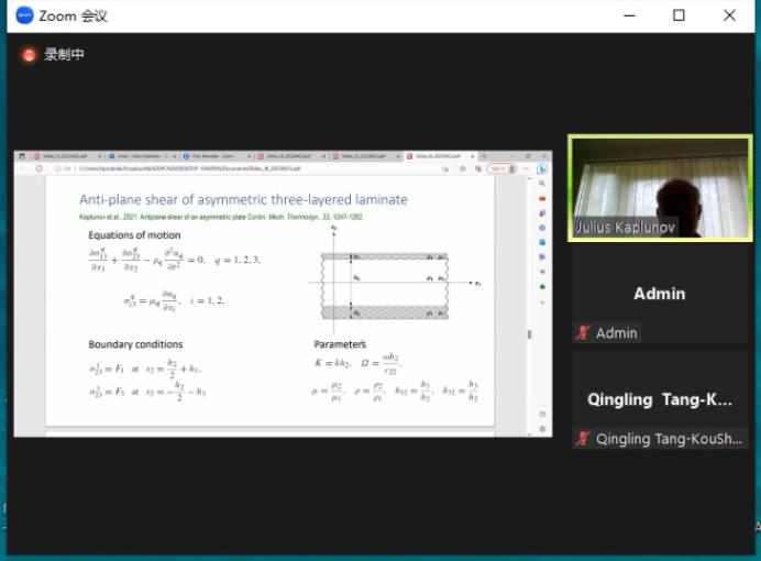 Julius Kaplunov教授针对薄层结构的多参数分析研究,介绍了力学、几何参数变化(如层厚度、刚度和密度)所带来的强纵向不均匀性效应。Alexander N. Galybin教授针对不同弹性层粘结在弹性基板上的复合材料,介绍了分层介质中界面缺陷无损识别的数学方法。