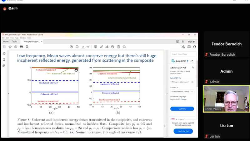 针对有机半导体薄膜应变和时间相关力学特性评估,Steve Bull教授着重介绍了在玻璃基板上使用纳米压痕法对100-300nm涂层样品开展的相关实验研究。针对能量在复合材料边界上的传递过程,John R. Willis教授着重讲解如何计算传入复合材料的平均能流和从边界反射的平均能流。