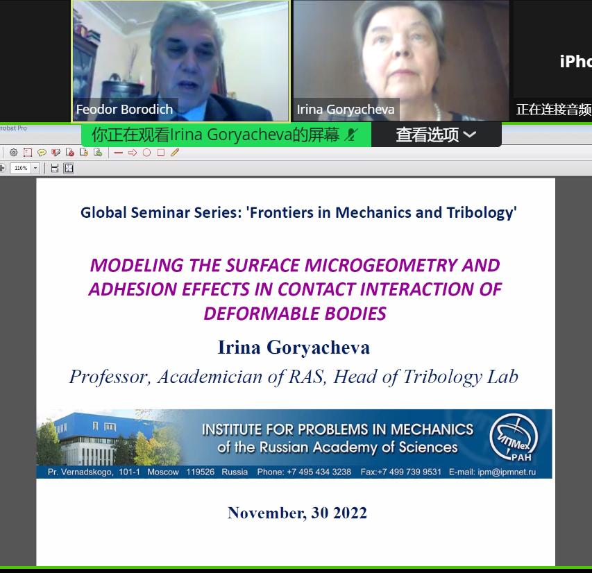 俄罗斯科学院外籍院士Fedor Borodich介绍了本次讲座的安排及嘉宾背景。Goryacheva教授担任俄罗斯科学院Ishlinsky力学问题研究所摩擦学实验室主任,莫斯科国立罗蒙诺索夫大学教授。她是俄罗斯国家理论与应用力学委员会主席、俄罗斯摩擦学委员会主席、RZD 科学委员会成员、国际摩擦学委员会副主席以及 IUTAM 主席团成员。 Goryacheva 教授发表了200多篇出版物,其中包括7部专著,分别荣获列宁共青团奖(1979年)、奥林匹亚国家妇女科学成就奖(2005年)、政府科技奖(2006年)和世界摩擦学金奖(2009年)。