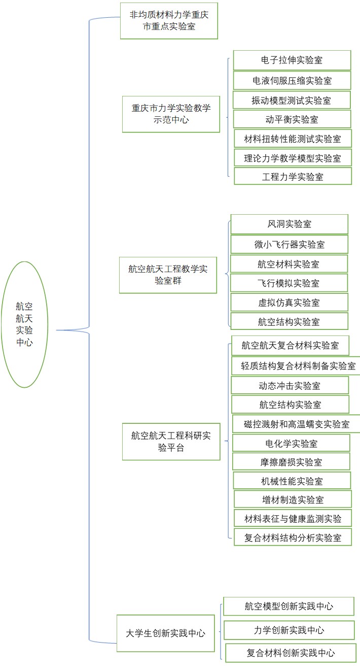 学院实验中心建设自学院成立之初开始,在原“非均质材料力学重庆市重点实验室”以及“重庆市力学实验教学示范中心”的基础上,经过六年的建设周期,新建了“航空航天工程教学实验室群”、“航空航天工程科研实验平台”以及“大学生创新实践中心”,目前已基本完成并初具规模。